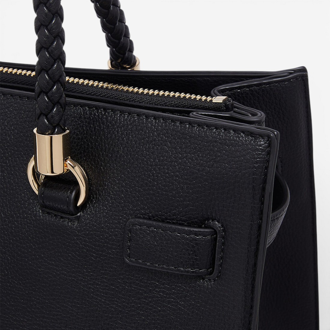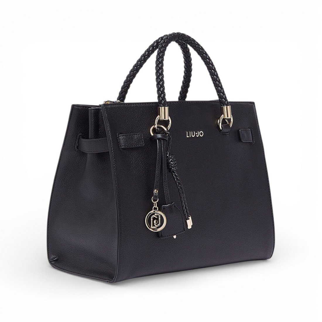 Borsa satchel in ecopelle nera effetto bottalato, elegante e pratica. Dotata di due scomparti con zip, uno centrale con bottone magnetico, manici intrecciati e tracolla regolabile e removibile. Completa di charm logo staccabile, è perfetta per chi cerca stile e funzionalità in un unico accessorio. Misure: 31 x 17 x 26 cm.