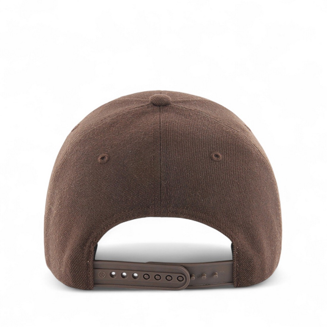 Cappello da baseball 47 Brand in acrilico e lana marrone con iconico logo New York Yankees ricamato in bianco sul davanti. Dotato di fibbia posteriore in plastica regolabile, offre comfort e stile per ogni occasione. Perfetto per look casual o sportivi.
