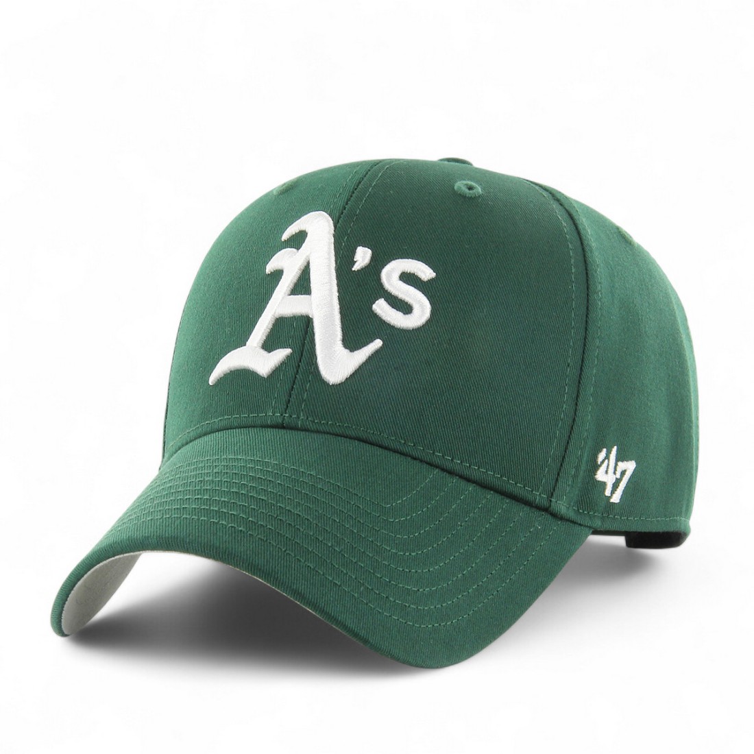 '47 BRAND - Cappello da baseball verde in poliestere e cotone con logo ricamato "Oakland Athletics" in bianco sul frontale. Dotato di fibbia posteriore in plastica per una regolazione facile e visiera inferiore bianca, è ideale per completare il tuo look sportivo con stile e comfort.Il nostro servizio clienti è a tua disposizione dal Lunedì al Sabato dalle 10:00 alle 19:30.