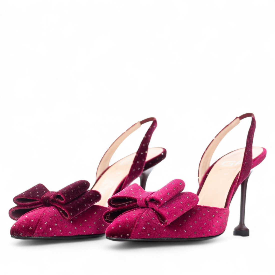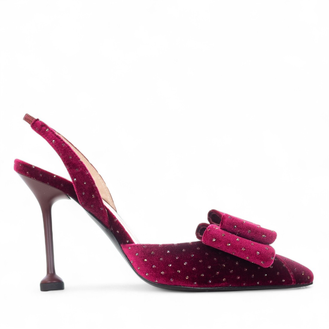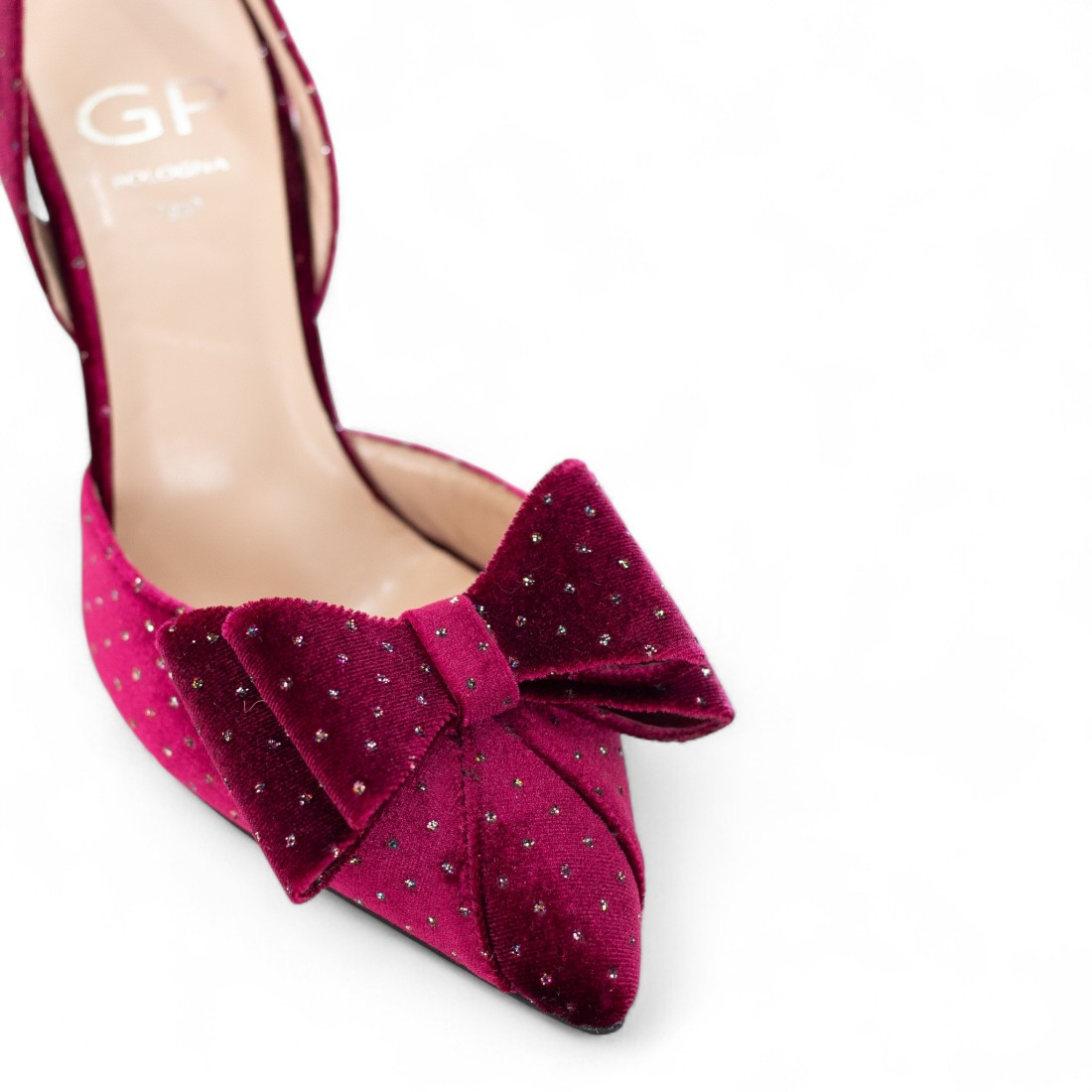 Decolleté G.P. Bologna in elegante velluto bordeaux, perfette per dare un tocco originale e sofisticato al tuo look. Il tacco di circa 10 cm slancia la figura, mentre i pois in brillantini multicolore donano luminosità e stile unico. Il fiocco sul davanti aggiunge un dettaglio raffinato. Suola e fodera interna in pelle, fondo in gomma per comfort e stabilità.