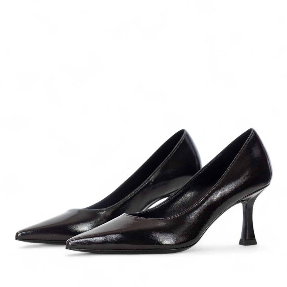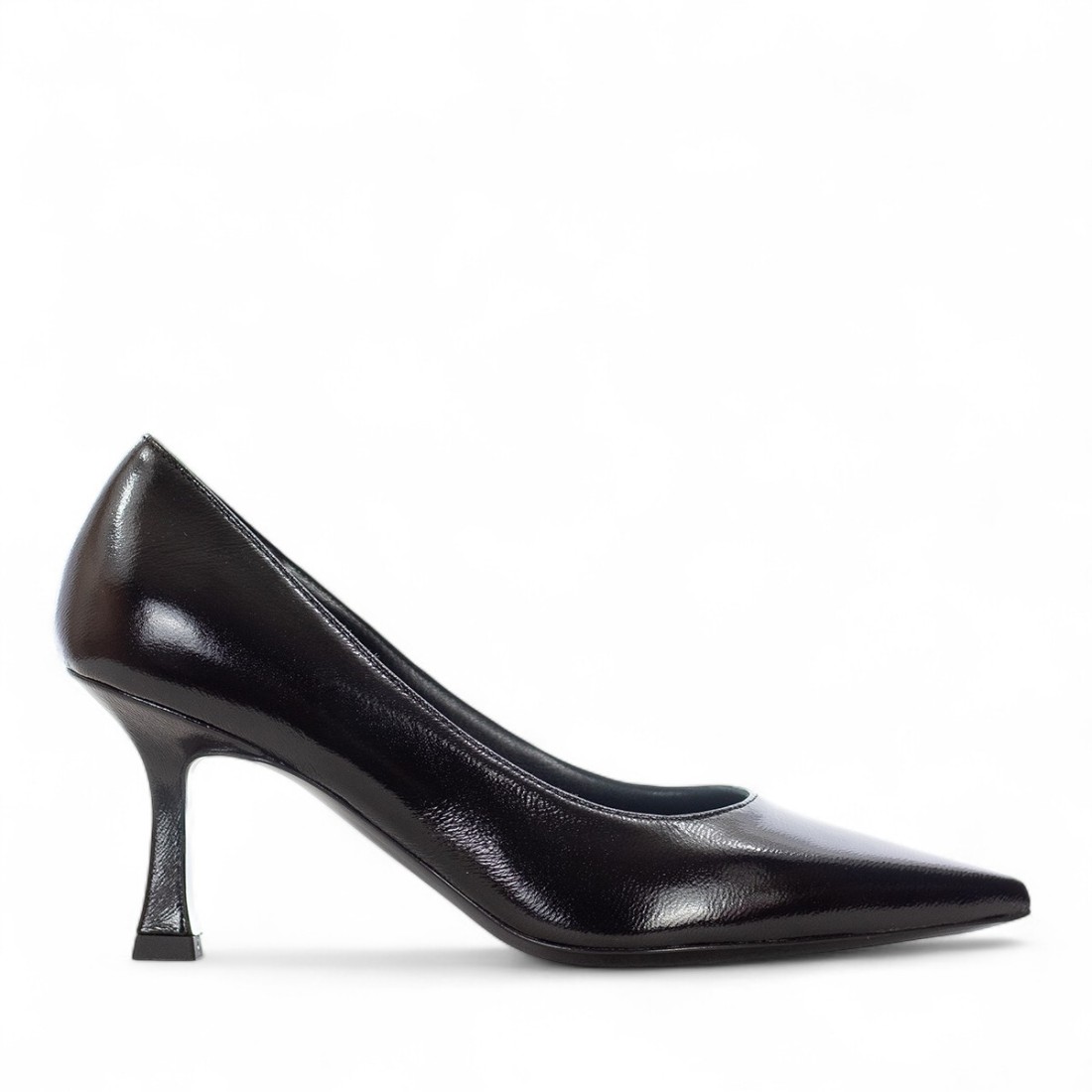 Decolleté in pelle nera lucida dal design classico e raffinato. Il tacco di 7,5 cm slancia la figura con eleganza, mentre fodera e suola interna in pelle offrono comfort per tutto il giorno. Il fondo in cuoio garantisce resistenza e stabilità, rendendo queste scarpe perfette per completare con stile qualsiasi look elegante.