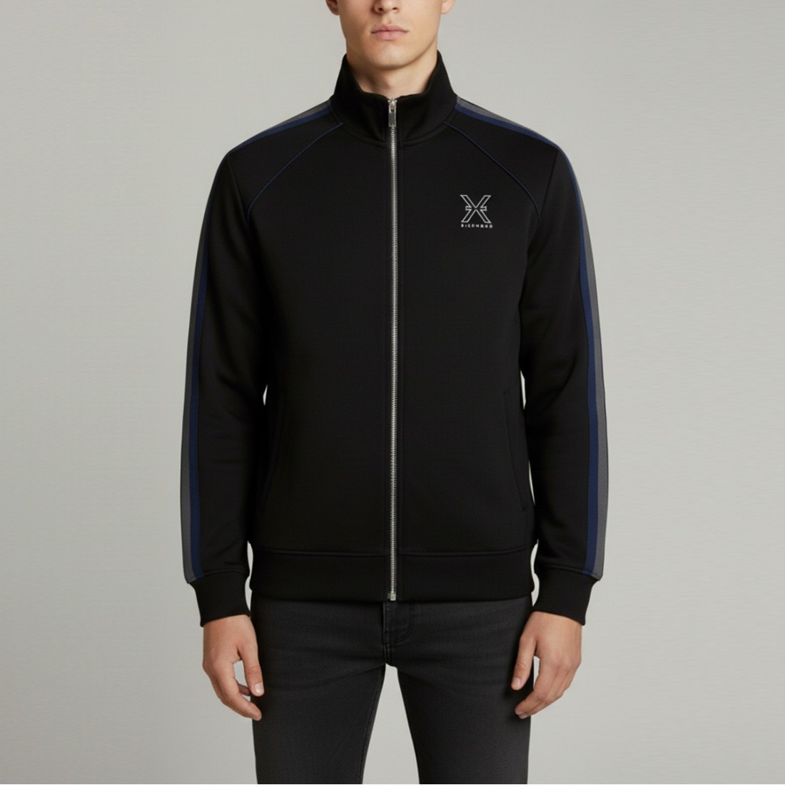 Felpa Richmond X in cotone nero con logo ricamato in rilievo sul petto e bande laterali blu e grigie. Presenta chiusura full zip, orli elasticizzati e fodera in rete traspirante. Dallo stile moderno e confortevole, questa felpa loose fit è ideale per un look casual e contemporaneo.