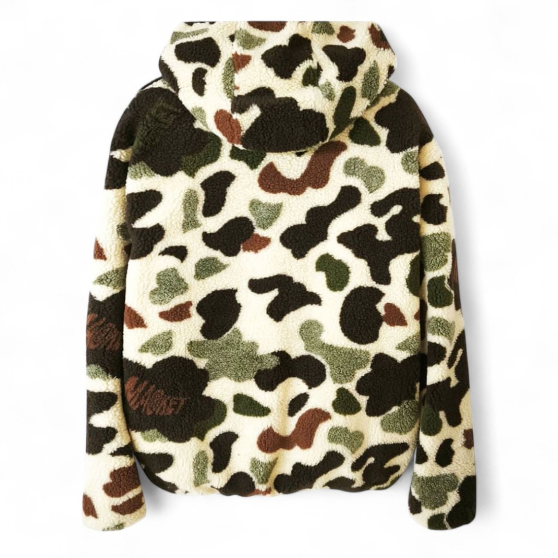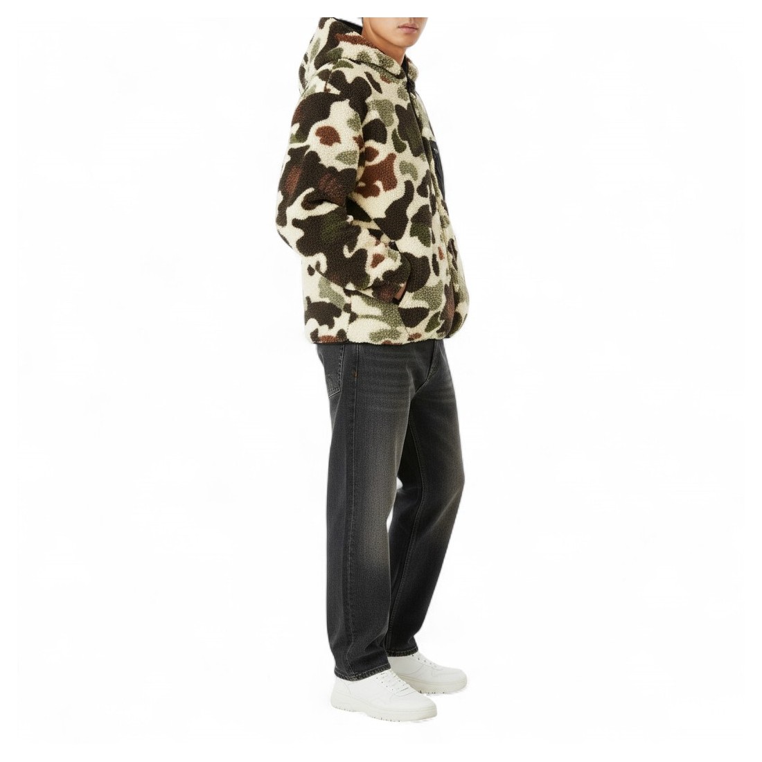 Giubbino da uomo MARKET beige in pelliccia ecologica maculata, con cappuccio e interno foderato. Presenta zip centrale, tasche laterali e tasca sul petto con patch logo, per un tocco urbano e contemporaneo. Vestibilità regular, realizzato in 53% acrilico e 47% poliestere. Perfetto per un look casual e pratico, lavabile in lavatrice.