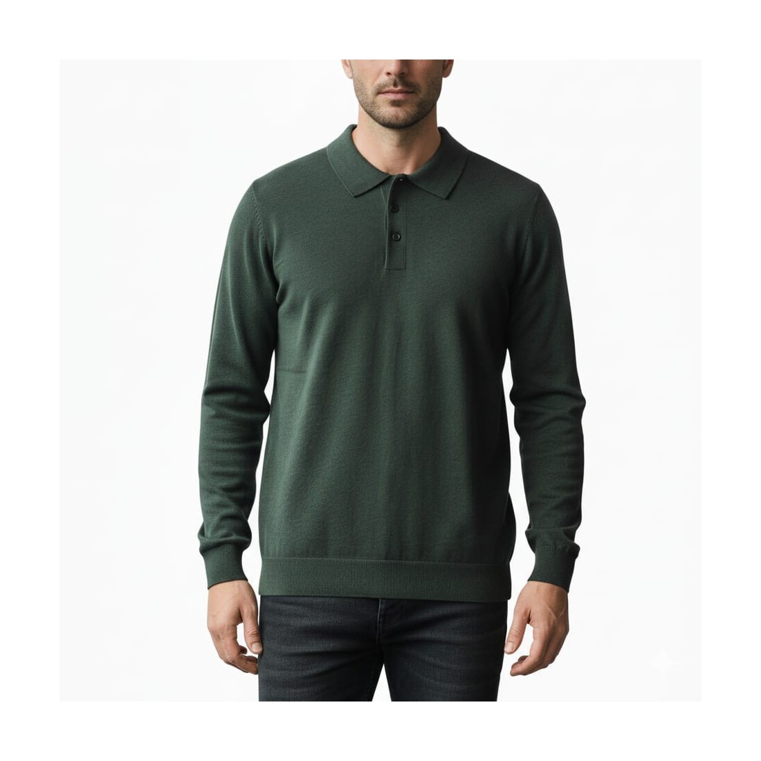 Polo a maniche lunghe Bottega Cinque in misto lana verde, realizzata con una combinazione di poliestere, nylon, acrilico e pregiata lana merinos. Presenta un collo classico con tre bottoni, polsini e orlo elasticizzati per una linea confortevole. Ideale per uno stile elegante e rilassato.