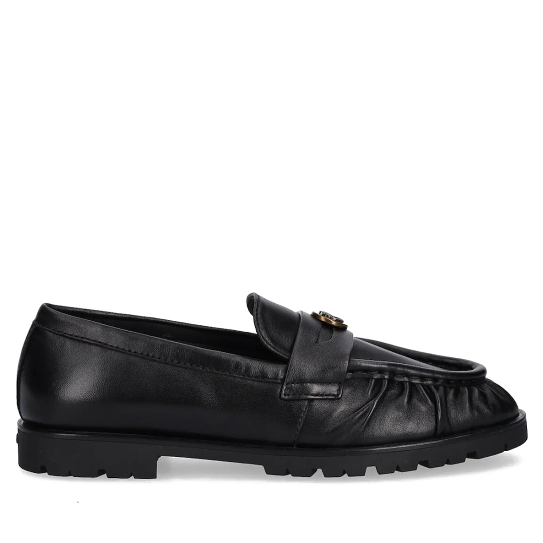 Mocassini in morbida pelle nera con punta tonda e mascherina arricciata e con logo Love Birds. La suola carrarmato con lettering PINKO, alta 2 cm, offre solidità e carattere. Un modello dal fascino deciso che unisce comfort, qualità e stile, perfetto per valorizzare qualsiasi look casual con un tocco raffinato e contemporaneo.