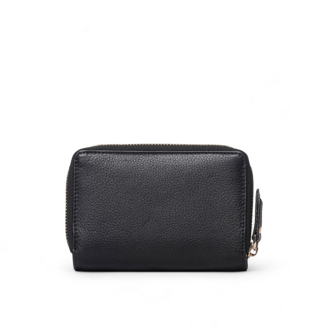 Elegante portafoglio Marc Ellis in ecopelle martellata nera con logo in metallo frontale. Design bifold con scomparto anteriore a pattina e chiusura magnetica, slot per carte e tasca principale con zip dorata all around. Perfetto mix di stile e funzionalità per ogni occasione. Dimensioni: 14 x 9 x 3 cm.