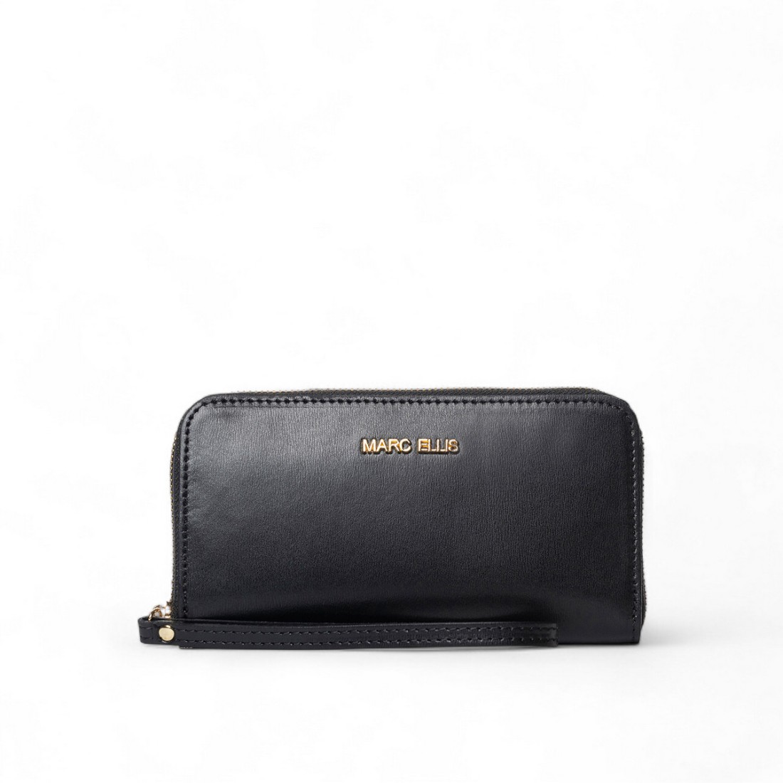 Portafoglio MARC ELLIS elegante e raffinato in pelle nera, impreziosito dal logo in metallo sul davanti. Dotato di scomparto per banconote, tasca portamonete con zip e pratici slot per carte. Chiusura zip all around per massima sicurezza. Dimensioni compatte: 20x10x3cm, ideale per ogni occasione.