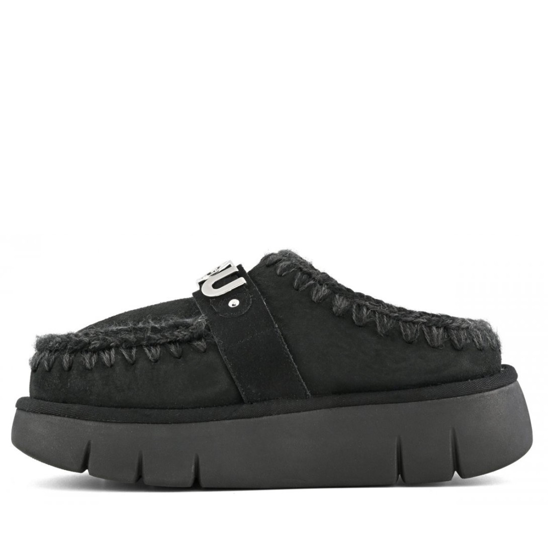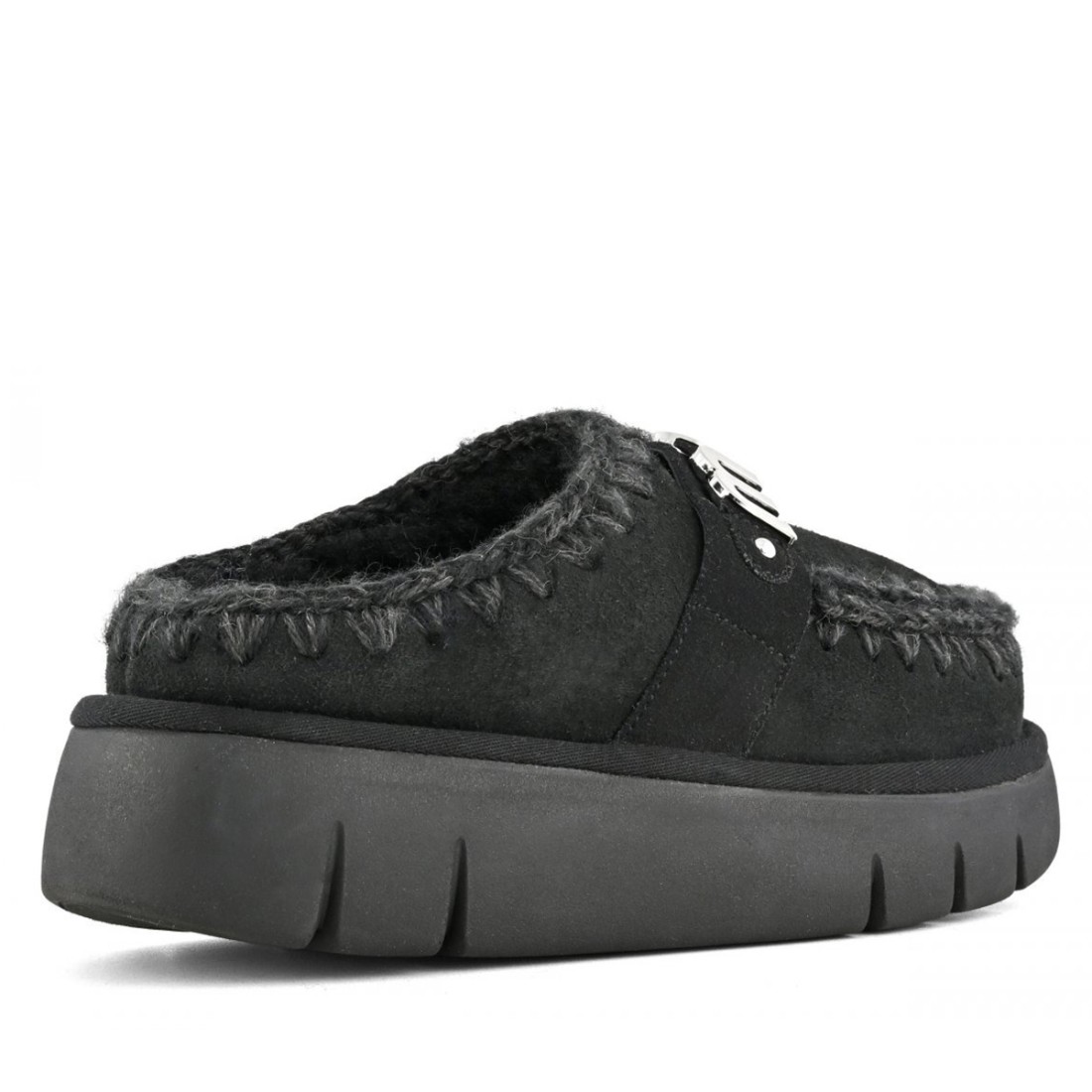 Sabot MOU Bounce Clog Metal Logo in pelle scamosciata nera con cuciture all’uncinetto realizzate a mano. L’interno è rivestito in morbido montone double-face che assicura calore e comfort. La tomaia presenta il logo MOU in metallo e la suola in gomma garantisce stabilità e durata. Ideale per look casual e ricercati in ogni stagione.
