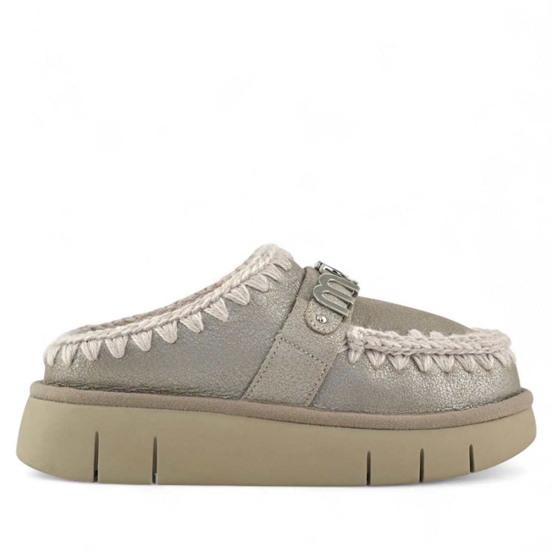 Sabot MOU Bounce clog special leather in pelle craccata beige pietra metallizzata con cuciture artigianali all’uncinetto e interno in soffice montone double-face. Dettagli curati, comfort avvolgente e suola in gomma resistente, completati dal logo in metallo sulla tomaia. Perfetti per uno stile ricercato e naturale nelle stagioni fredde.