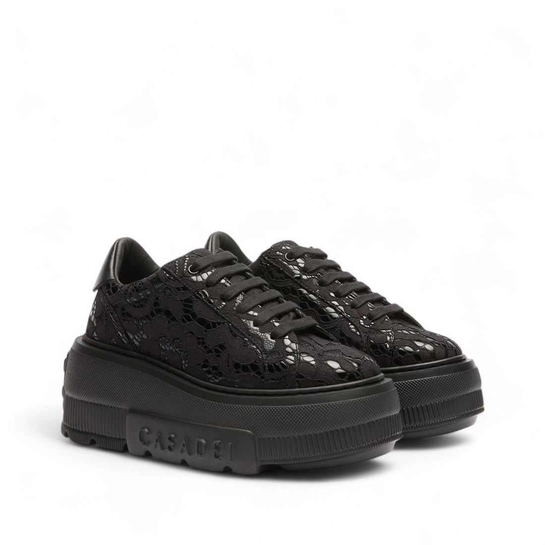 Sneakers Liberty Nexus in tessuto verniciato con raffinata applicazione di pizzo ton sur ton, che unisce eleganza e modernità. La zeppa ultra leggera da 70 mm dona comfort e slancio, arricchita dal logo Casadei laterale e dal distintivo logo C-chain sotto la suola. Un modello iconico, 100% Made in Italy, perfetto per chi ama distinguersi con stile e femminilità in ogni occasione.