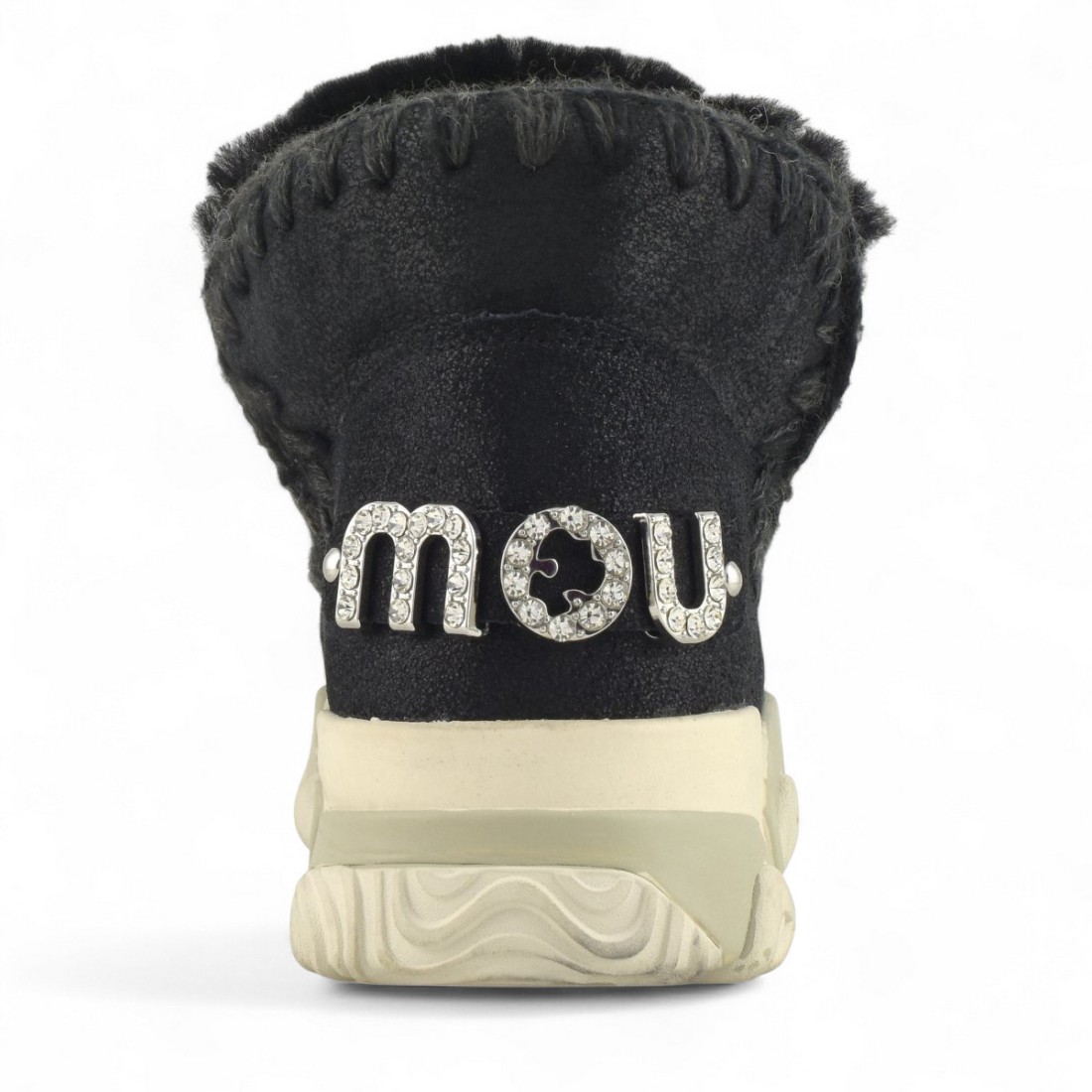 Scopri le sneakers MOU Eskimo Trainer Logo Rhinestones in pelle craccata nera, impreziosite da cuciture all’uncinetto e logo in metallo con strass sul retro. L’interno in morbido montone double-face assicura comfort e calore, mentre il fondo in gomma garantisce una perfetta tenuta. Ideali per uno stile ricercato e autentico ogni giorno.