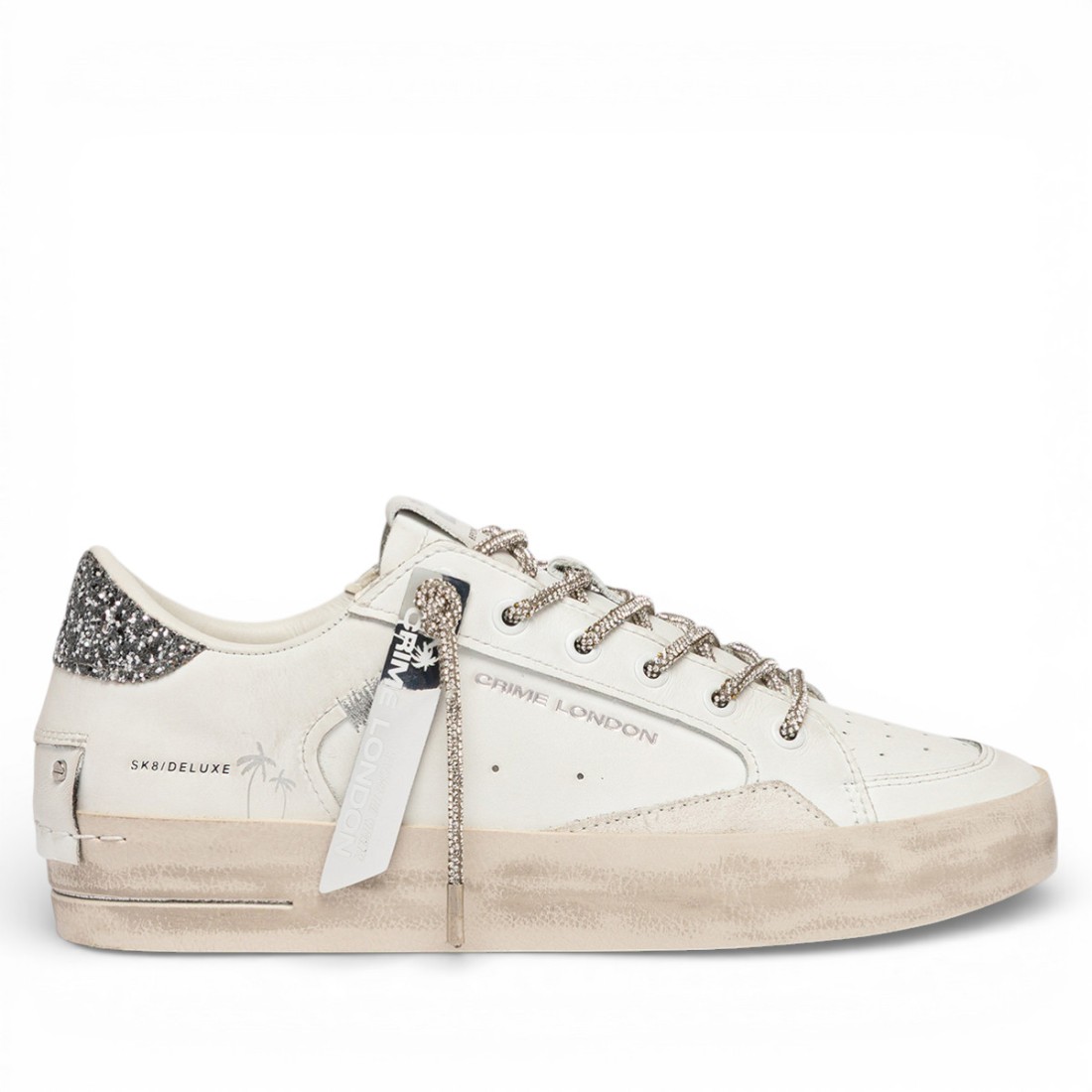 Le sneaker CRIME LONDON SK8 Deluxe uniscono stile e carattere: pelle bianca di qualità, dettagli in suede e glitter argento, doppio laccio con strass e patch posteriore in pelle. Suola in gomma, effetto vintage e fodera in pelle e tessuto garantiscono comfort e vestibilità regular. Perfette per chi cerca un look unico e raffinato in ogni occasione.Il nostro servizio clienti è a tua disposizione dal Lunedì al Sabato dalle 10:00 alle 19:30.