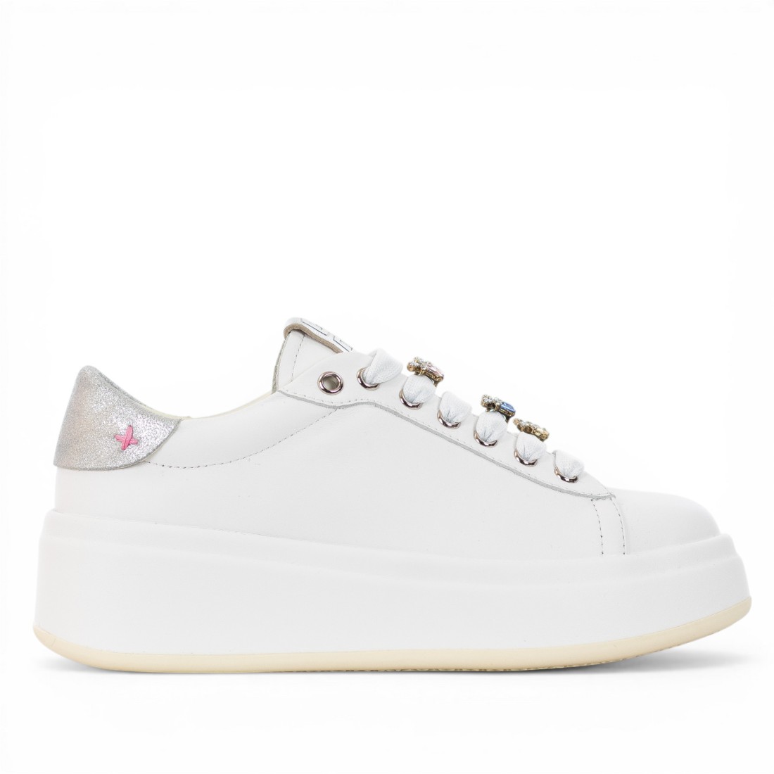 Sneakers GIO+ in pelle bianca dal design moderno, arricchite da un inserto effetto craccato silver sul retro che dona carattere. Linguetta con logo in rilievo e accessori removibili sulle stringhe per personalizzare lo stile. Fondo in gomma alto 50 mm per un look contemporaneo e comfort quotidiano. Perfette per completare outfit casual con un tocco distintivo.