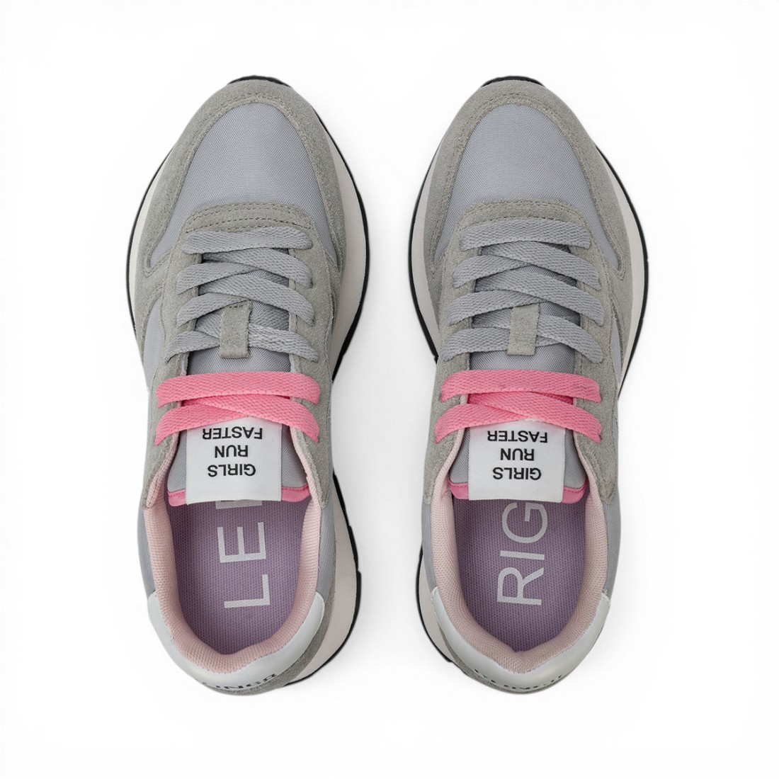 Sneaker Ally Solid firmata SUN68, realizzata in nylon e suede grigio con inserto posteriore in ecopelle bianca. Dotata di chiusura con lacci in cotone e logo ricamato sul lato, unisce stile sportivo e cura dei dettagli. La fodera in micro mesh garantisce traspirabilità, mentre la suola in EVA fresata a mano con battistrada in gomma assicura comfort e stabilità durante tutta la giornata.