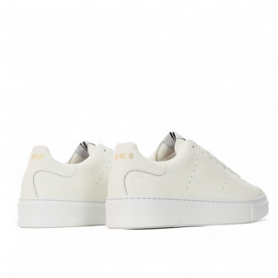 Sneakers da uomo Thoms Nicoll in pelle bianca, eleganti e versatili. La fodera e la suola interna in tessuto garantiscono comfort tutto il giorno, mentre il fondo in gomma extralight offre leggerezza e resistenza. Dettagli di stile con il logo sulla linguetta e sul morsetto, per un tocco distintivo ad ogni passo.