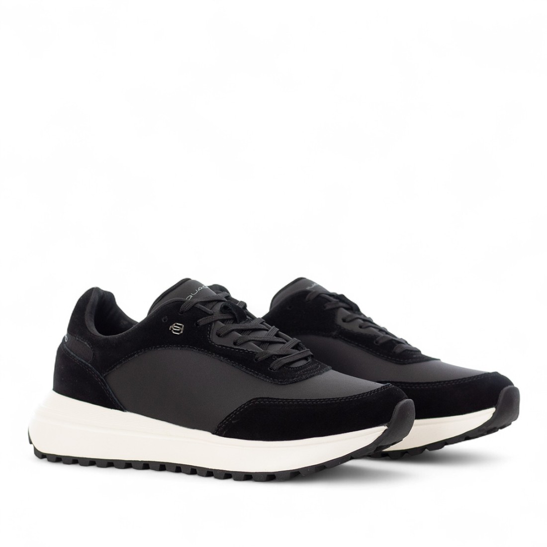 Sneakers Piquadro in pelle nera con dettagli in camoscio tono su tono, eleganti e raffinate. Fodera e suola interna in tessuto per il massimo comfort. Suola in gomma e fondo di circa 50 mm, perfette per uno stile contemporaneo senza rinunciare alla comodità.