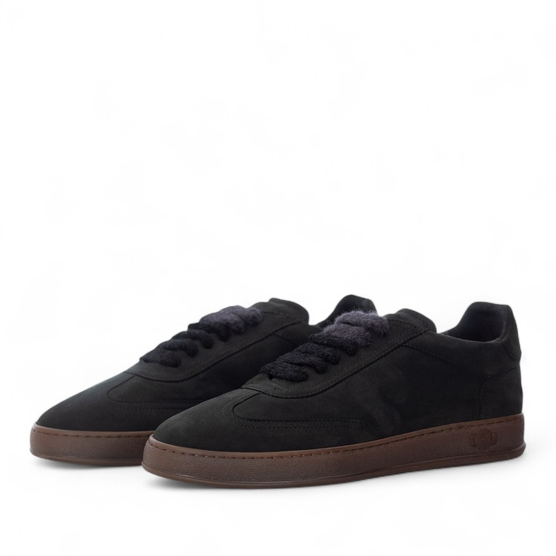 Sneakers uomo SOLDINI 80 in pelle scamosciata nera. Dotate di fondo in gomma da 25 mm per un comfort ottimale e stile casual. Presentano logo ricamato sul retro e inciso sulla linguetta, per un tocco distintivo. Fornite con due paia di stringhe intercambiabili. Fodera e soletta interna in pelle e tessuto per traspirabilità e morbidezza.