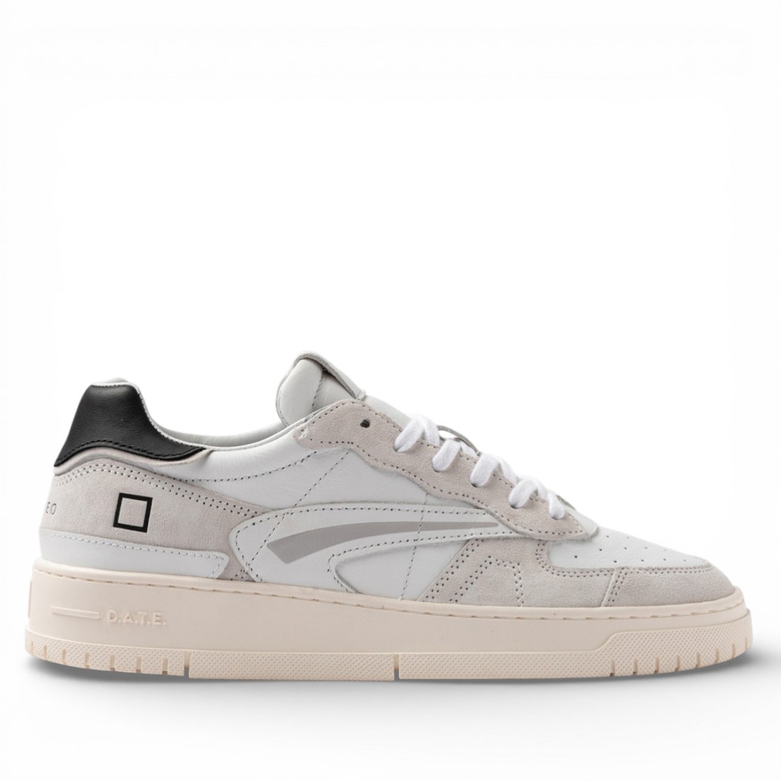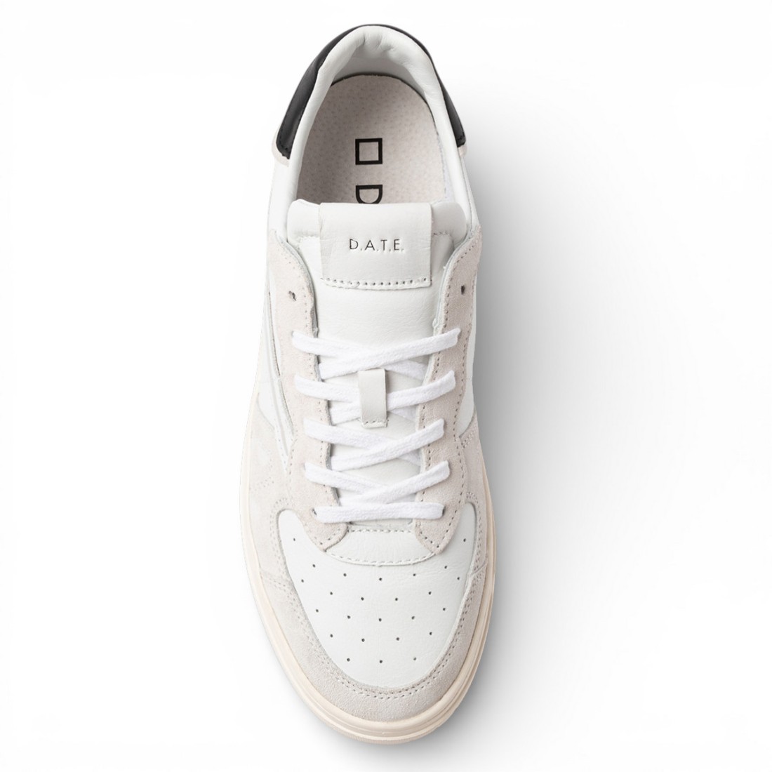 D.A.T.E. sneakers basse in pelle bianca con dettagli in suede tono su tono. Punta traforata per respirabilità, label in pelle con logo sulla linguetta e logo quadrato sul lato. Lacci in cotone, talloncino nero e nome del modello sul retro. Fodera in pelle e spugna di cotone, suola in gomma per comfort e stile quotidiano.