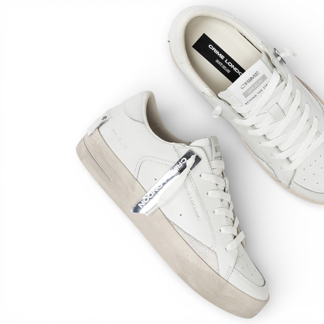 Le sneaker SK8 Deluxe di Crime London uniscono stile urbano e cura artigianale. Realizzate con tomaia in pelle bianca e dettagli in suede tono su tono, presentano talloncino e linguetta in pelle con label logata, patch posteriore e iconico tag specchiato argento. Fodera in pelle e tessuto per il massimo comfort, suola fasciata panna in ecopelle ed effetto vintage. Vestibilità regular.