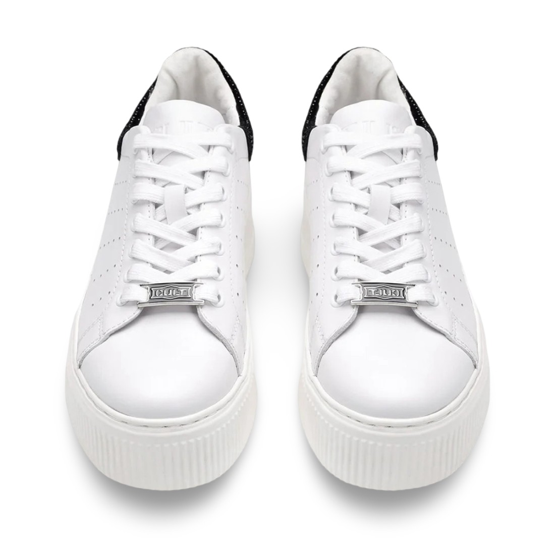 Sneaker Perry 3162 firmata CULT, realizzata in pelle bianca con elegante inserto posteriore in suede nero impreziosito da strass applicati. Il logo è presente sulla linguetta e su una borchia sul retro. La suola in gomma alta 5,5 cm garantisce comfort e slancio, perfetta per completare look casual con un tocco distintivo.