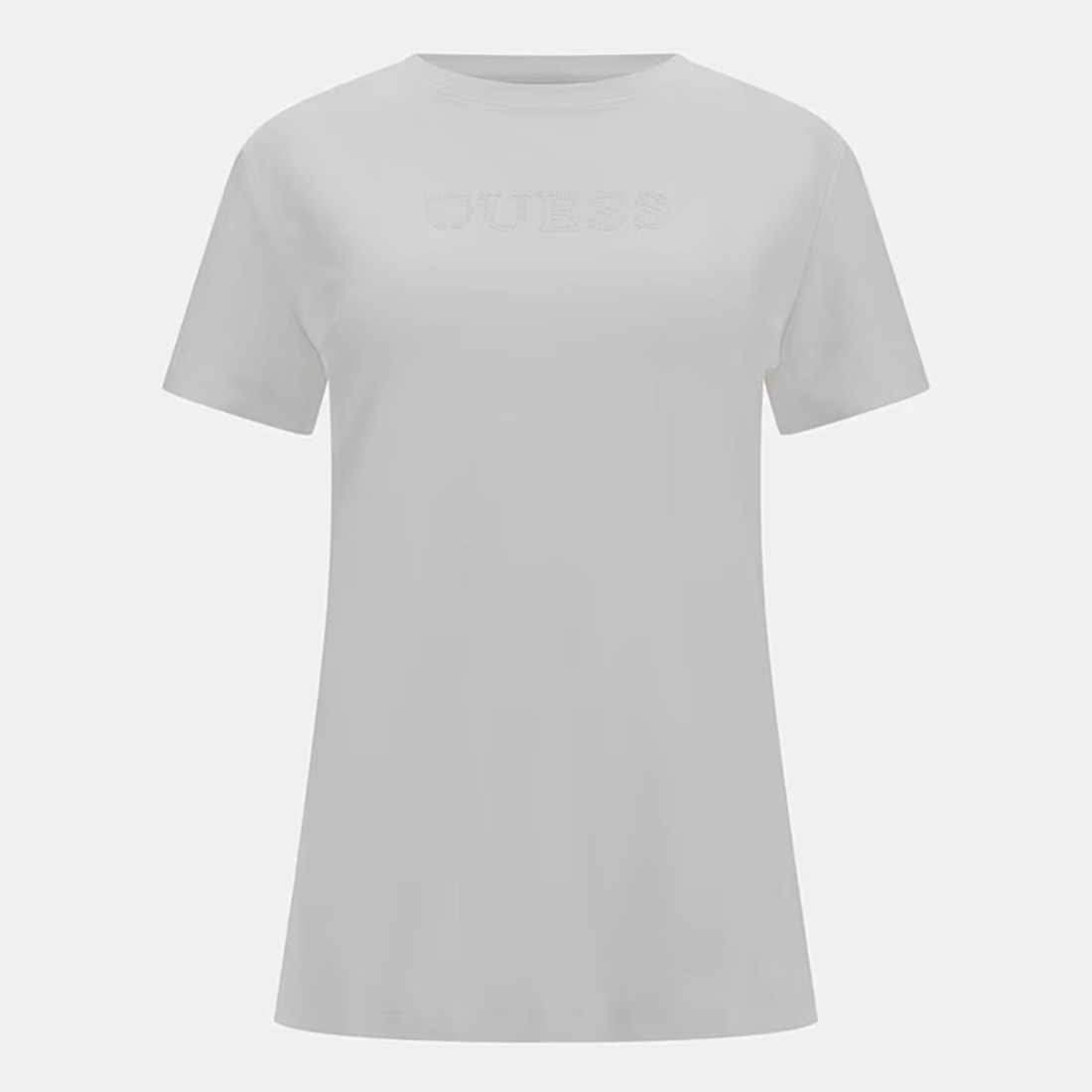 T-shirt GUESS in morbido jersey di cotone bianco (95% cotone, 5% elastan), perfetta per un look casual ma curato. Il modello girocollo con vestibilità regolare assicura comfort durante tutta la giornata, mentre il logo lettering in strass sul davanti aggiunge un tocco luminoso e femminile. Facile da abbinare con jeans, gonne o pantaloni per outfit versatili e alla moda.