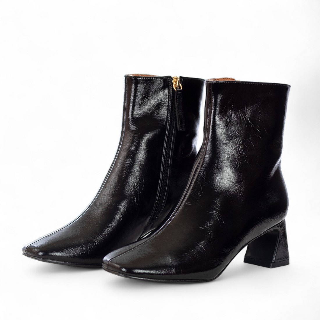 Tronchetto EXÉ in ecopelle nera effetto wrinkled, elegante e versatile. Dotato di zip laterale funzionale, tacco da 60mm e fondo in gomma per una camminata sicura. Fodera e soletta interna in ecopelle, perfetto per completare look casual o sofisticati con stile e comfort duraturi.