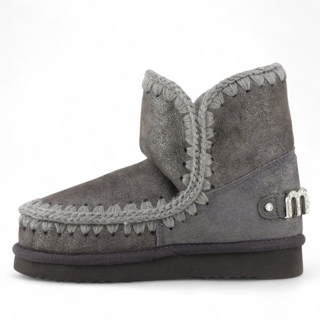 Scopri il tronchetto MOU Eskimo 18 Rhinestones Logo in pelle craccata color grigio polvere di ferro, rifinito con cuciture all’uncinetto e logo Mou con strass sul retro. L’interno in soffice montone double-face assicura comfort e calore, mentre la suola in gomma offre stabilità e durata. Uno stile autentico e distintivo per ogni stagione.
