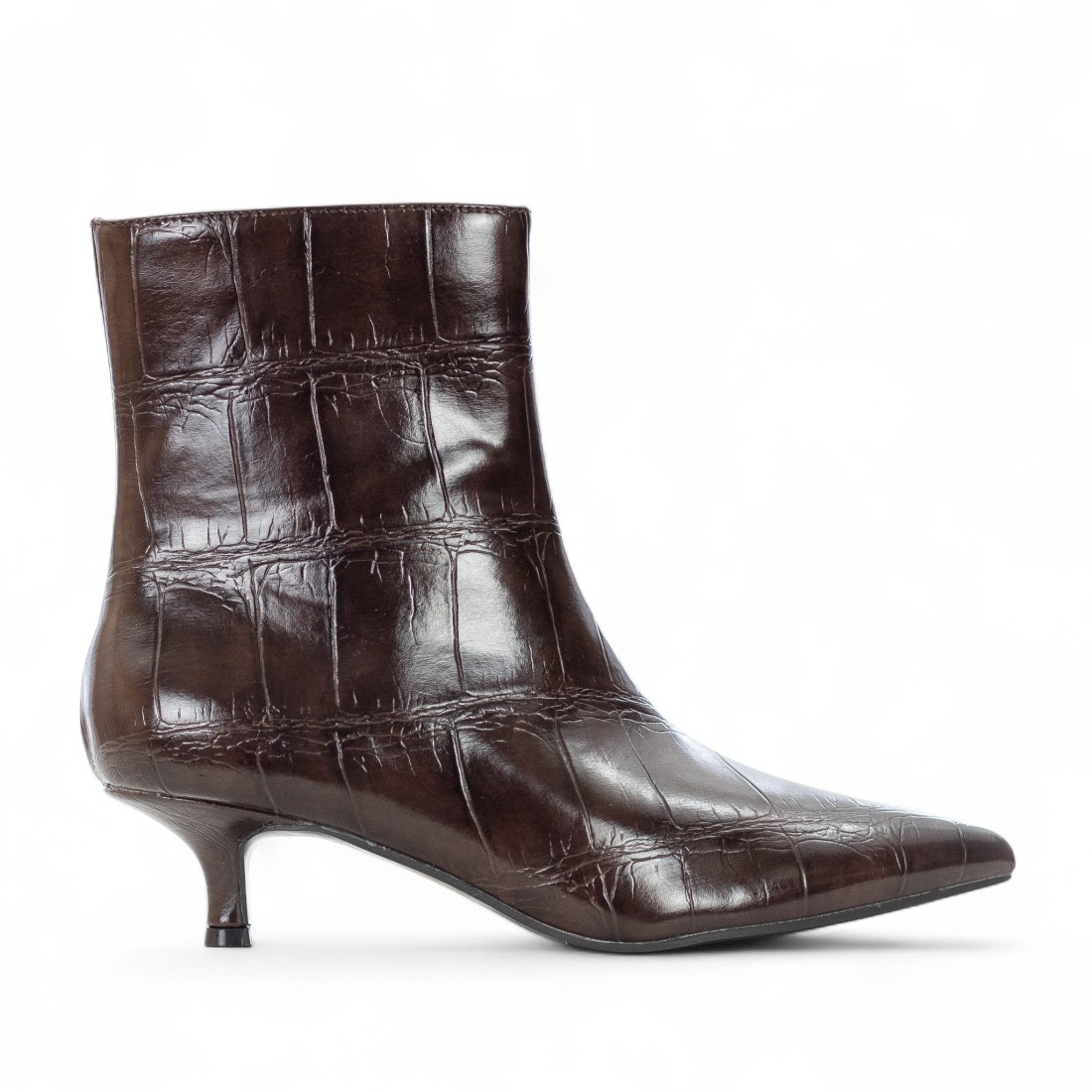 Tronchetto Exé in eco pelle effetto croco marrone, perfetto per dare un tocco originale e sofisticato al tuo look. Il tacco di circa 50 mm garantisce comfort e stile. Dotato di pratica zip laterale, fodera in tessuto ed ecopelle, suola in pelle e fondo in gomma per una calzata stabile e confortevole.