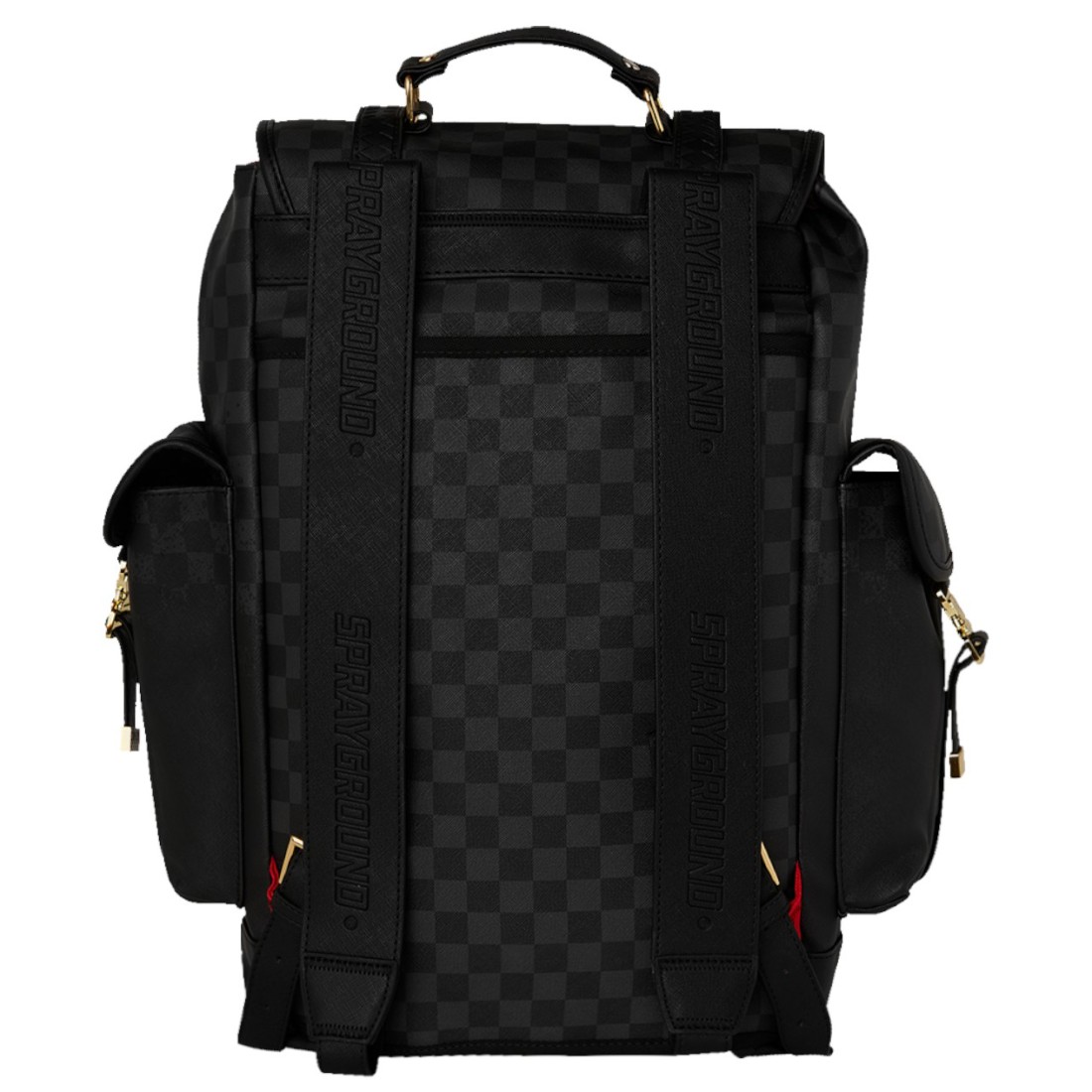 Zaino Sprayground Blackout Savage Deluxe: design elegante total black con stampa a scacchi tono su tono e finiture gold. Ampio, funzionale e impermeabile, perfetto per viaggi, lavoro o look street sofisticati. Chiusura con fibbie metalliche e tasche laterali capienti. Urban luxury allo stato puro.